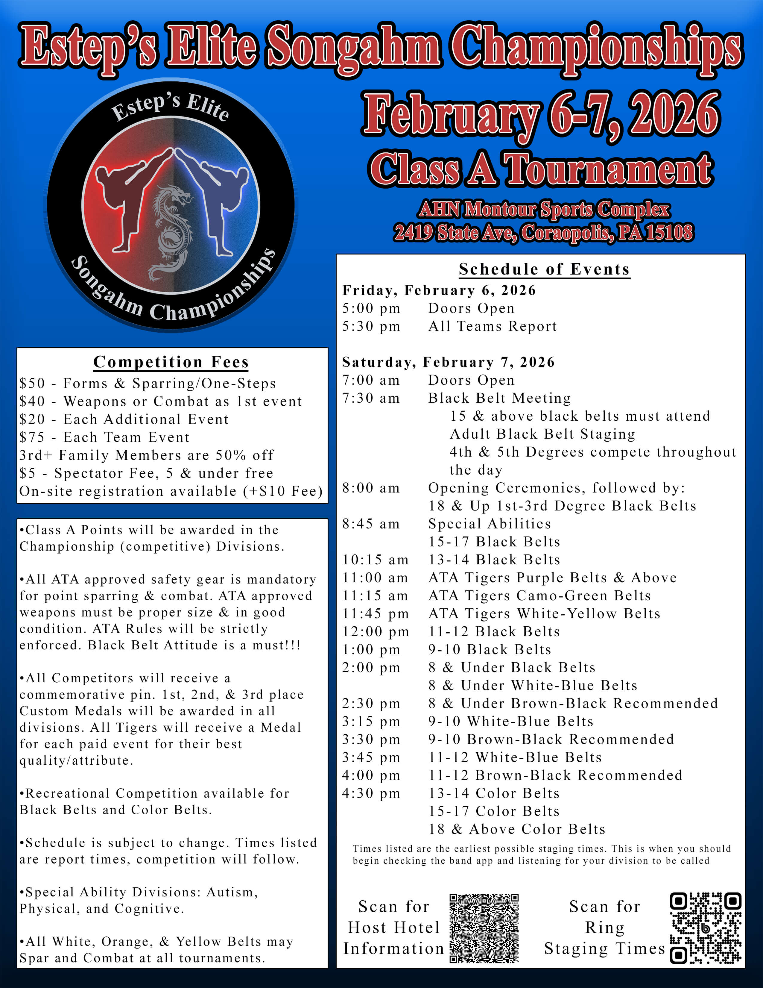 * All ATA-approved safety gear is mandatory for point sparring & combat. ATA-approved weapons must be of proper size & in good condition. ATA Rules will be strictly enforced. Black Belt Attitude is a must!!!